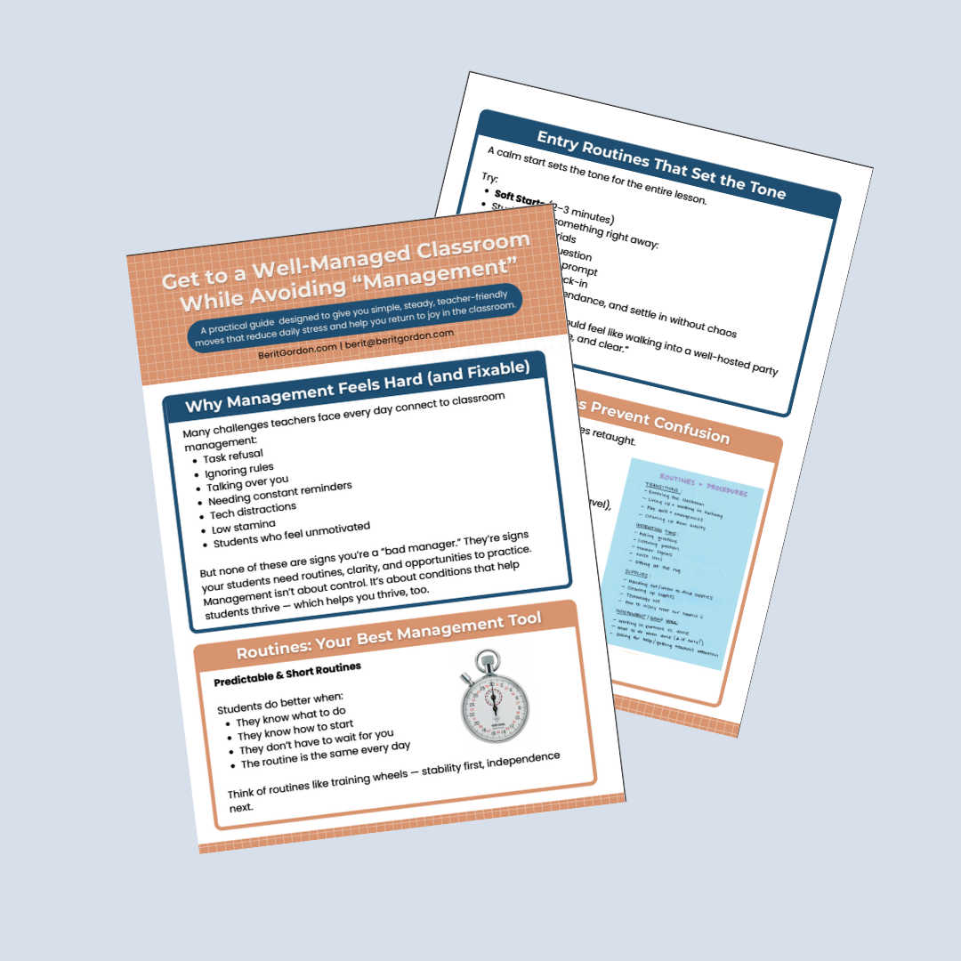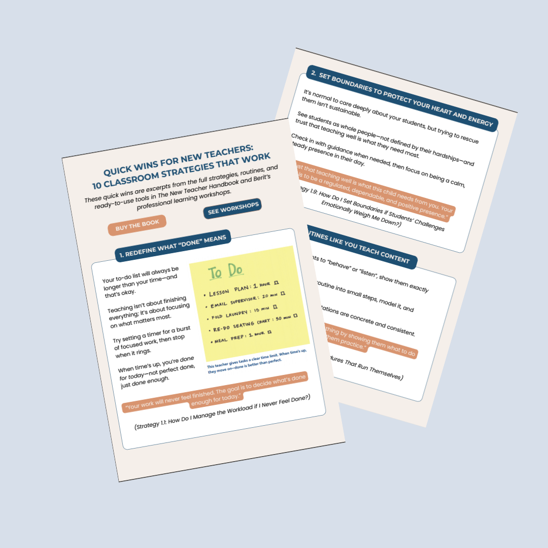 This free guide offers 10 “quick wins” — small shifts that make a big difference in your classroom. Each strategy is an excerpt from the full lessons, routines, and ready-to-use tools in The New Teacher Handbook and Berit’s professional learning workshops.